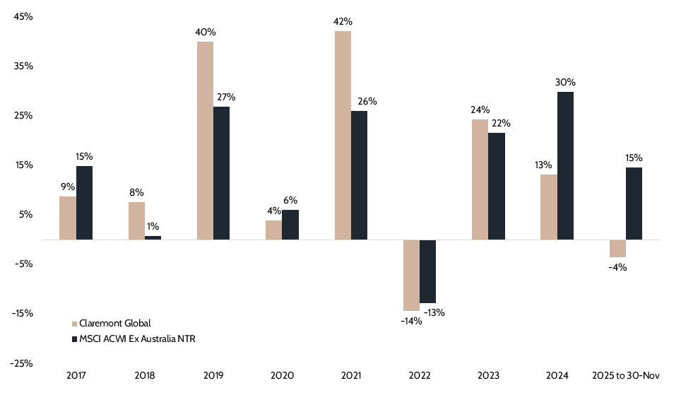 Claremont Global Fund Active ETF calendar year return (net) vs benchmark